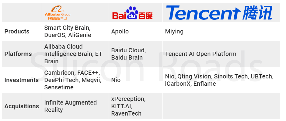 Despite an early lead for Baidu in the AI space and numerous acquisitions, it is yet to gain significant traction with its most costly endeavour, the Apollo self-driving car system compared to international competitors. Tencent was a relatively late entrant, however, had made early investments across a broad range of smaller companies. Alibaba has rolled-out an expansive smart-city platform which from an initial trial in Hangzhou, has now been expanded across China.
